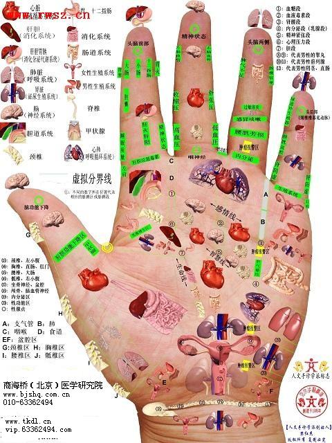 健康的手指都一样: 指甲粉红色,有光泽,厚薄适中,软硬适度,不易折断,表面光滑,指甲根部半月形(甲半月,又叫健康圈)呈白色。 五指养生速查 手部有6 条经脉循行,与全身各脏腑、组织、器官沟通,大约有99 个穴位(区),可以反映全身五脏六腑的健康状况。按摩或按压这些穴位,几乎可以缓解全身疾病。 五指 对应经络 对应器官 拇指 肺部经络 心脏和肺 食指 大肠经络 胃、肠和消化器官 中指 心包经络 五官、肝脏 无名指 三焦经络 肺和呼吸系统 小指 心、小肠经络 肾脏、循环系统 不健康的手指各有不同: 甲半月颜色 灰色:可能精力弱,容易引起贫血、疲倦、乏力。 粉红:可能脏腑功能下降,体力消耗过大,容易引起糖尿病、甲亢等病症。 紫色:容易引起心脑血管血液循环不良,供血供氧不足,易出现头晕、头痛、动脉硬化。 黑色:多见于严重的心脏病、肿瘤或长期服药者。 甲半月面积 最好:面积占指甲1/5。 小于1/5:表示精力不足,肠胃吸收能力差。如甲半月突然晦暗、缩小、消失,应早期预防一些消耗性的疾病、肿瘤、出血等。熬夜、性过多时,甲半月也会消失,很难再长出来。 大于1/5:多为心肌肥大,易患心脑血管、高血压、中风等疾病。 指甲状态 色泽发暗,有多条竖线分布:这是体内水分不足的体现,并且该手指对应的体内器官和组织功能虚弱。 色泽发暗,凸凹不平,有多条横线分布:这是贫血以及营养不良的体现,或者数月前曾身体不调。 手部有6条经脉循行与全身各脏腑组织、器官沟通。大约有99个穴位(区)可以反映全身五脏六腑的健康状况与全身各脏腑组织、器官沟通。