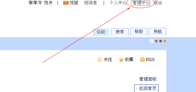 版主或超级版主,登录前台后,点击“管理中心”可以进入版主管理界面: