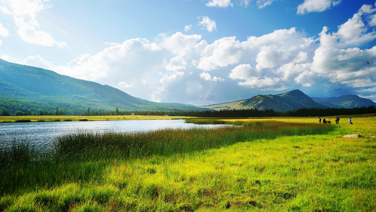 鸭泽湖的远方是耸立的云杉林带,再往远便遥望阿尔泰山。