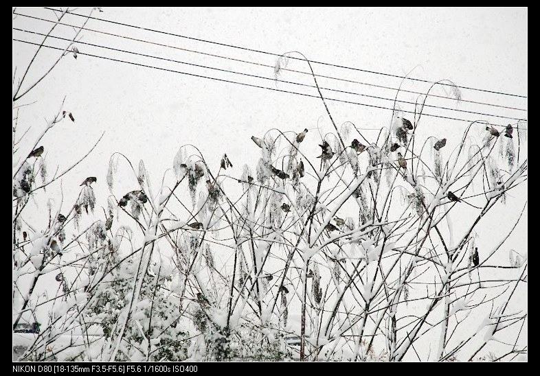 晚上回家时,天已经完全黑下来了,在路边我又看到了白天的那一幕:一群黑压压的小鸟,从一棵树飞到另一棵树,同样是叽叽喳喳的鸣叫,却听起来像哀嚎、像哭泣,撕裂着寂静的夜空,我恍然大悟:一定是这场大雪毁了它们的家,毁了它们以往的平静生活。害得它们饥寒交迫,无家可归,所以才这样漫无目的的到处飞、这样令人心碎地哀嚎。我仰头看着它们向远处飞去,再不忍心拍它们了,更为自己不能帮助它们而难过。这场大雪、这个寒冬,也许会夺去很多无助的小生命。