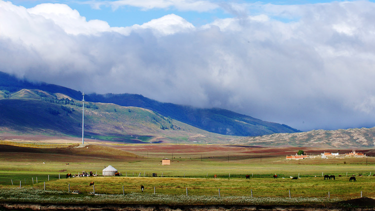 更奇幻的是那云了。云层从阿尔泰山绵延下来,由高及低覆盖茫茫的大草原;浮云或凝重或轻舒,轻抹如纱的有之,浓蘸成团的亦有之;云聚云散玩转太阳,让阳光时隐时现,令山麓草原时阴时晴;云动光随,掠过山麓拂过草原,刚刚看到光明由远及近伸展过来,倏忽间又由近及远延宕过去;所有一切都在不停的变化当中,转瞬间就换了天地。