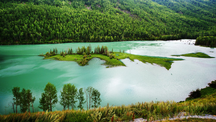卧龙湖。喀纳斯河急泄而下,冲出的滩涂河洲酷似一条恐龙。