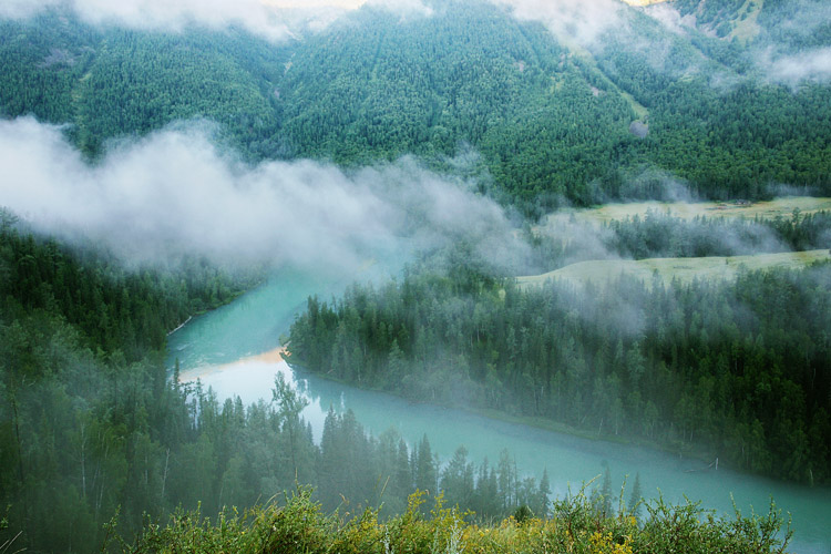 喀纳斯河到这里拐了个S湾,曲线柔美、风情万种。周遭有云杉林怀拥遮蔽。雾轻扬,从林中蒸腾缭绕树梢;云重抹,自天泄下又横空扫过;云遮雾障,河曲、层林和背景的山峦时隐时现。清晨的第一缕阳光照在山顶上,金色、白色或红色的什么彩都有了。