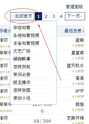 将鼠标移到“湖南知青网论坛2011年度”发贴专题上,即可展开菜单,选择菜单转跳到想找的栏目。