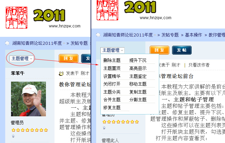 主题和帖子管理主要包括:删除主题、主题置顶、设置精华、关闭打开、主题分类、合并主题、修复主题、提升下沉、高亮显示、主题鉴定、移动主题、复制主题、分割主题等主题管理操作和屏蔽帖子、删除帖子和警告帖子等帖子管理操作。 这些操作可以在主题列表页和内容查看页面进行: