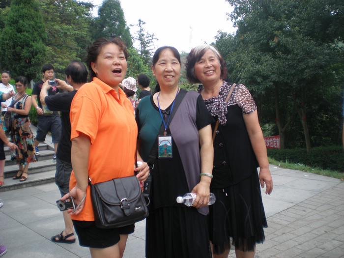 留守江永长沙女知青(俩拿水瓶者)王再云(穿红背心者)及(暂不知姓名者)2007年同赴江永旅游的长沙知青在女书村留影