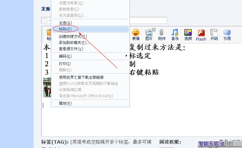 湖南知青网论坛上的图片,无论是旧版本还是今年的新版版本,无论是本栏目还是其它栏目,贴子上的图片复制过来方法是: 1、将要复制的图片用鼠标选定 2、点鼠标右键,选择复制 3、打开新页面发贴>点右键粘贴