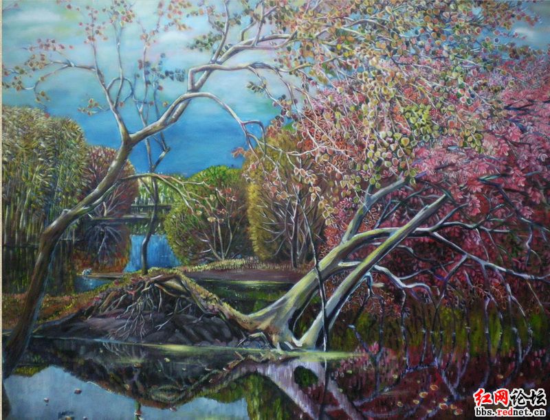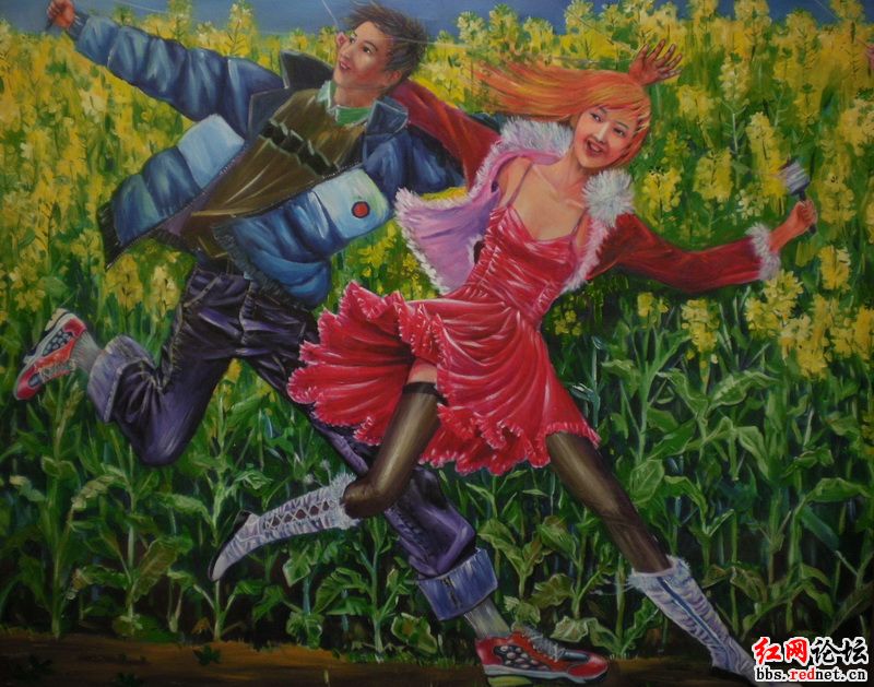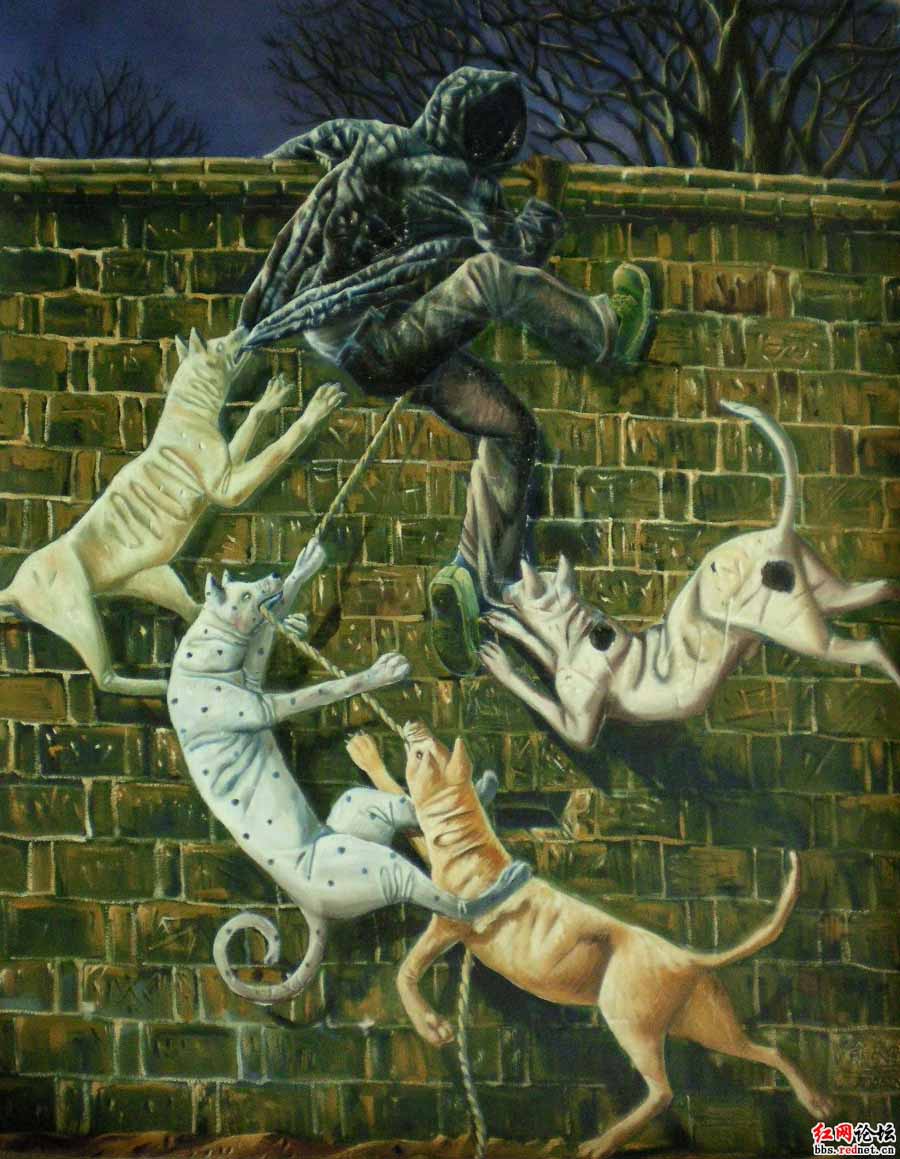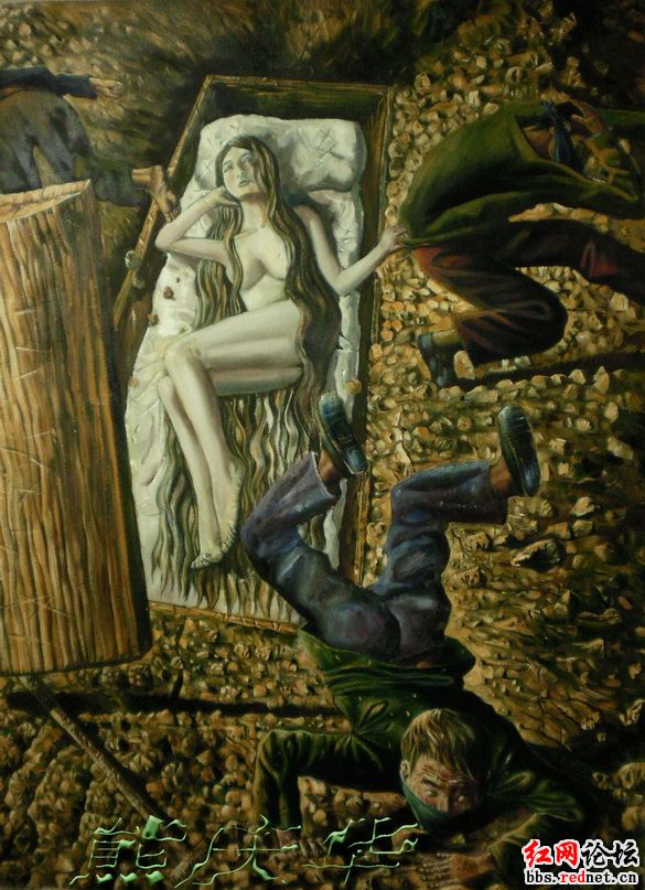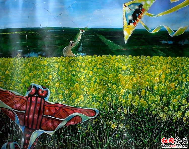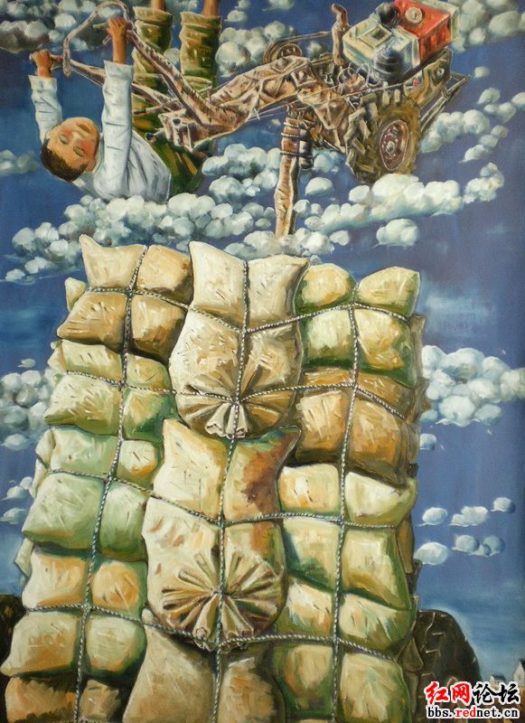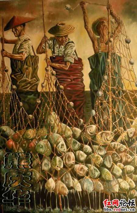 下学后他在家里种地、养鱼。很难想象一个农民能把绘画的热情保持近20年,并且没有减退的意思。用他自己的话说,就是对抽烟、喝酒、抹牌之类的完全没有兴趣,甚至反感,在农民中无疑是个异类。除了干农活就是画画!问他画了这么多年有没有跟什么人交流过?比如美院的老师之类的。他说没有,没有机会,并且他也不善于与人交流,他身边的人除了农民还是农民!他在读初中的时候自己订了《美术大观》,上课画,下课也画。现在订了很多杂志和画册,在家里反复的临摹和创作,近20年的作品堆起来比人还高!(无师自通?)