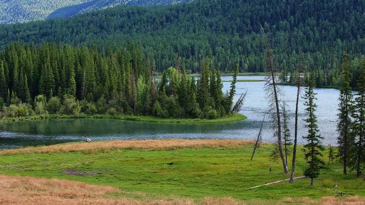 鸭泽湖的远方是耸立的云杉林带,再往远便遥望阿尔泰山。