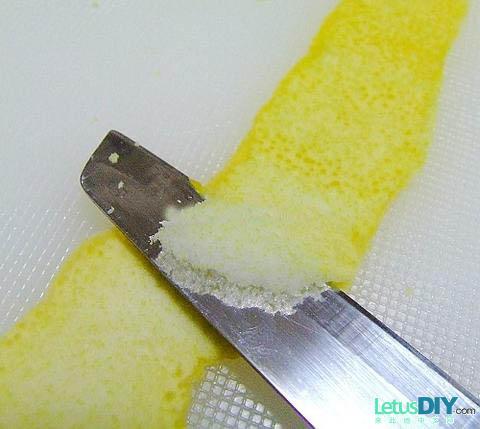 2、把柚子涂抹上一层盐刷净干净;用刀将最外面那层黄绿色的皮薄薄的刮下来,尽量薄一些,少带里面的白瓤,否则会很苦。这是柚子祛痰镇咳的精髓所在;