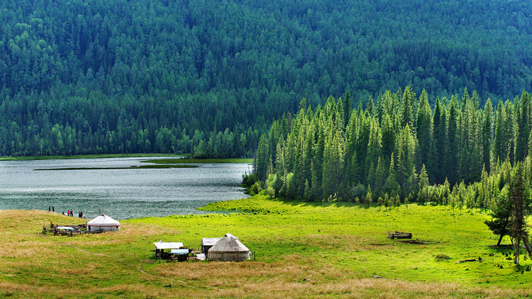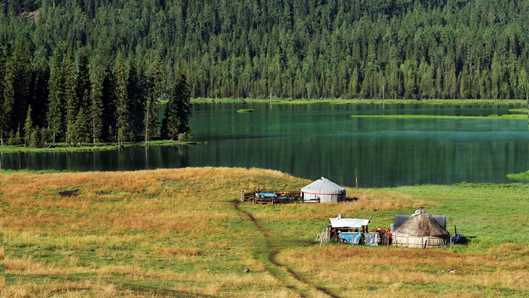 鸭泽湖的远方是耸立的云杉林带,再往远便遥望阿尔泰山。