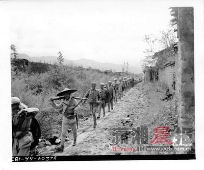 [4] 1944年9月15日,胜利的中国军队离开他们攻下的石城腾冲,这支装备并不先进的行军部队,应是攻城的预2师、198师、116师、36师和130师其中之一。摄影/美国照相兵 Frank Manwarren