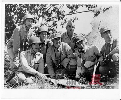 [2]中国军队指挥官(前排右二可能是预二师参谋长、后任副师长的彭劢;前排右三可能是预二师师长顾葆裕)和美军联络官在一处高地俯瞰被战火包围的腾冲。