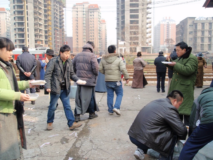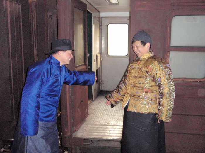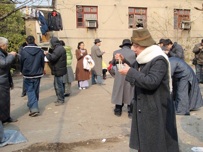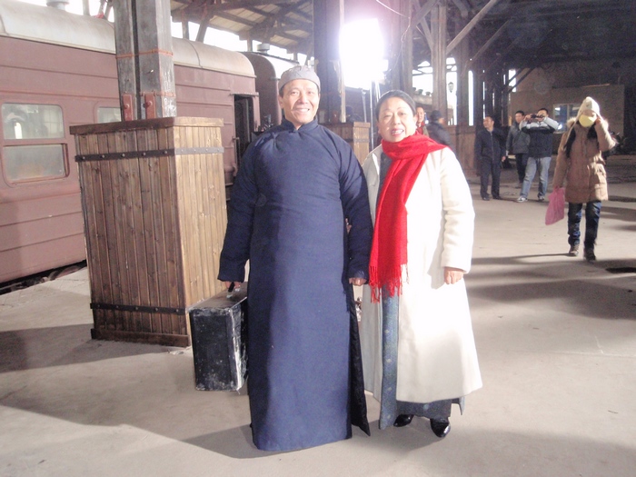 北站拍电影记 昨天,又是为拍电影《湘江北去》起了个早床;又是换上长袍马褂,不过是棉的;服装师可能记起了我,又往我头上扣一顶瓜皮帽,把我打扮成土地主;又是一上午我们群众演员没戏,但这回我们没有出长沙,就在老北站拍摄。我们这组来了八人,有两人没来,除达因女士、行者和我是上星期去靖港拍摄过外,另五位是上地团、渠江飞龙、曾老师和一对夫妇,他们都是初来的。 剧组将北站的一老货房布景成老北京站的站台,站台边停了五六节客车车厢,车厢被涂料刷成棕色,昨天在这里已拍完了青年毛泽东到了北京,今天还是利用这站台和车厢来拍毛泽东离开长沙,杨开慧来送他,我们群众演员就扮成旅客。 整个一上午就是他们两人的戏,毛泽东站在开动的火车车门口,杨开慧追赶着火车给毛送围巾,饰杨开慧的是《山楂树之恋》中的女主角周冬雨,是位纯青白净的小姑娘,相对来说,保剑峰饰毛泽东就成熟些。这个镜头拍了六七次才成功,每次杨开慧都得追着火车跑三四十米,也够累的。然后就拍毛泽东站在启动的火车上伸手想接围巾但又没能接到的镜头,站台上的摄影机也跟着火车同步的拍。过后,摄像机又移到火车上,导演也坐在火车里,从车上来拍杨开慧追火车的镜头,随后拍蔡和森,蔡畅、萧子升、向警予和杨开慧一道送毛的镜头,这里面有一个熟面孔,《天天向上》里的钱风饰萧子升。后来把我们所有的群众演员都叫到火车上,坐在靠站台的窗户位置上,从车下拍送别的镜头。就是这样导演从不同的角度反复来拍这个镜头。 昨天虽出了太阳,但气温仍低,站台上穿堂风大,尽管我们穿的是新做的棉长袍马褂,但还是感觉冷。站台上又没地方坐,站着也累,我们这几个人就坐到车厢里。看了车厢里的温度计,车厢里也只四度,但没风,到底暖和点,后来不少群众演员学我们样上车来避寒和休息。火车也听导演的指挥,一下开出站台,一下又倒回站台来,我们坐在车上随它来回奔波。另一组的一位老人说,“搞了半天才晓得拍电影都咯样做假的”,大家都笑了起来,不知他以前是真的不知道?还是说故意说的笑话。 火车拉车厢的镜头一直拍到中午一点多才结束,我们才去吃中饭,中饭还是盒饭,中饭后上车厢休息了一会儿。下午三时多才开拍群众演员上车的镜头,这时我们发现站在导演边上的一位气质高雅的中年妇女有些面熟,额头上有颗痣,这是奚美娟,在本片中她饰杨开慧的母亲,她真人比电视里得还漂亮些,导演对她格外亲切,左一口阿娟、右一口阿娟的。导演对这三个主要演员都特别客气,喊饰毛泽东的保剑峰叫保峰或保仔、唤周冬雨就冬雨、冬雨的,像母亲唤女儿似的,叫别的演员就只直呼他们所演的角色的名字。下午这个重头戏是杨开慧和她的母亲在站台上送毛泽东上火车,他们三人站在车门旁依依话别,我们就从他们的身边陆续上车。 开拍前只听见导演一人指挥的声音,“冬雨,往右移一点,多了,可以了”,“保峰不要说话了”,“阿娟,脸偏一点,好啦,开拍!”一声令下,我们群众演员就鱼贯的走向车厢的另一个门上车,我们只是作为他们三位主要演员的活动背景,摄影机拍的全是我们的背影,就这个镜头也反反复复拍了多遍,导演才满意。最后又叫些群众演员坐在车厢里,他们三人仍在车下话别,都是现场录音,我们都不能出声。等拍完这些,天完全黑了,才让我们卸妆收工,这也只让我们群众演员回家,他们还得继续拍下去,还在摄影场地吃晚饭,够辛苦的。 照片附后,因使用的是卡片机,在摄影棚内光线差,效果不好。