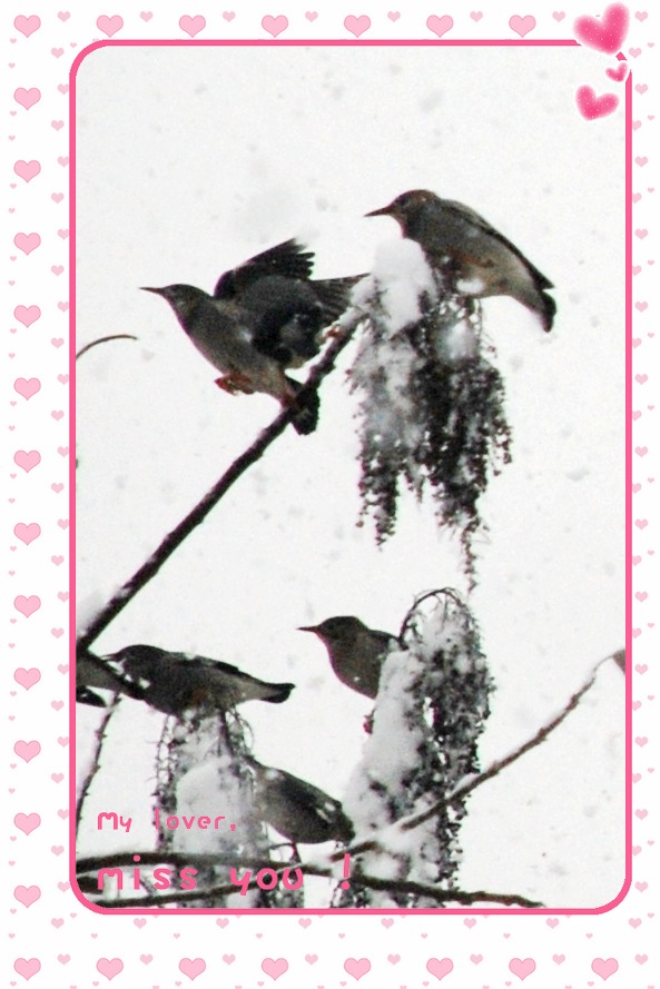 昨天在拍雪景时,突然飞来一群黑压压的小鸟,它们唧唧喳喳的叫着,从一棵树飞到另一棵树,每一次落脚,都把树梢的雪震落下来,像银河,像瀑布,真是美极了。我拿着相机追赶着它们,和它们一起高兴。只可惜下午要去听音乐会,不然,我会跟着它们一直跑下去的。 晚上回家时,天已经完全黑下来了,在路边我又看到了白天的那一幕:一群黑黑压压的小鸟,从一棵树飞到另一棵树,同样是叽叽喳喳的鸣叫,却听起来像哀嚎、像哭泣,撕裂着寂静的夜空,我恍然大悟:一定是这场大雪毁了它们的家,毁了它们以往的平静生活。害得它们饥寒交迫,无家可归,所以才这样漫无目的的到处飞、这样令人心碎地哀嚎。我仰头看着它们向远处飞去,再不忍心拍它们了,更为自己不能帮助它们而难过。这场大雪、这个寒冬,也许会夺去很多无助的小生命。