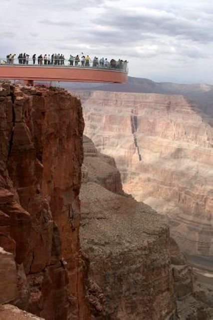 大峡谷分为南峡谷和西峡谷,南峡谷即大峡谷国家公园,西峡谷为印第安人居住地,由一些投资者参与开发,不归大峡谷公园管理,这儿最有名的景点为2007年落成的玻璃桥,这个被誉为世界第八大奇迹的人造U型空中桥廊,是一位华裔移民金鹏耗资3000万美元,历经10年构思、说服印第安人才得以建造。桥宽约3米,从飞鹰崖向外延伸出21米,飘架于距谷底约1200多米的半空,任何人走上桥廊,失足深渊的惊悸和漫步云端的妙感都会交错而生。游客只能在桥上逗留约15分钟,而且不能带相机上桥,只能由特设的摄影师为你拍照,参观西峡谷的费用远比南峡谷高。