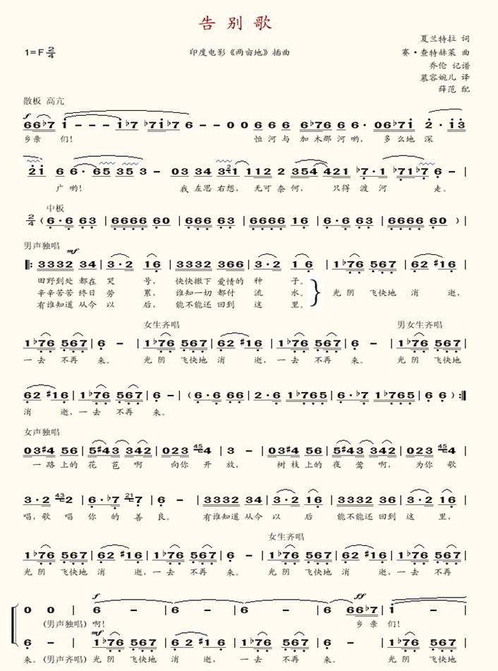 这是一部60年代上映的印度电影两亩地中的一首幽愤又不甘沉沦的优秀插曲:(田里的歌声)或者叫(告别歌)。这首歌当年在我们江永知青中广为流行,唱出了心中的无奈,也勉励自己要坚强,要照样大声来歌唱。用歌声伴我们渡过那漫长的严寒岁月。
