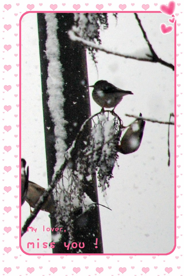 昨天在拍雪景时,突然飞来一群黑压压的小鸟,它们唧唧喳喳的叫着,从一棵树飞到另一棵树,每一次落脚,都把树梢的雪震落下来,像银河,像瀑布,真是美极了。我拿着相机追赶着它们,和它们一起高兴。只可惜下午要去听音乐会,不然,我会跟着它们一直跑下去的。 晚上回家时,天已经完全黑下来了,在路边我又看到了白天的那一幕:一群黑黑压压的小鸟,从一棵树飞到另一棵树,同样是叽叽喳喳的鸣叫,却听起来像哀嚎、像哭泣,撕裂着寂静的夜空,我恍然大悟:一定是这场大雪毁了它们的家,毁了它们以往的平静生活。害得它们饥寒交迫,无家可归,所以才这样漫无目的的到处飞、这样令人心碎地哀嚎。我仰头看着它们向远处飞去,再不忍心拍它们了,更为自己不能帮助它们而难过。这场大雪、这个寒冬,也许会夺去很多无助的小生命。