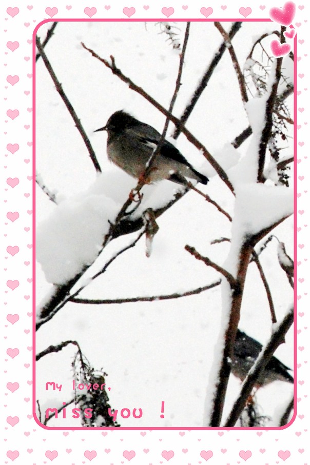 昨天在拍雪景时,突然飞来一群黑压压的小鸟,它们唧唧喳喳的叫着,从一棵树飞到另一棵树,每一次落脚,都把树梢的雪震落下来,像银河,像瀑布,真是美极了。我拿着相机追赶着它们,和它们一起高兴。只可惜下午要去听音乐会,不然,我会跟着它们一直跑下去的。 晚上回家时,天已经完全黑下来了,在路边我又看到了白天的那一幕:一群黑黑压压的小鸟,从一棵树飞到另一棵树,同样是叽叽喳喳的鸣叫,却听起来像哀嚎、像哭泣,撕裂着寂静的夜空,我恍然大悟:一定是这场大雪毁了它们的家,毁了它们以往的平静生活。害得它们饥寒交迫,无家可归,所以才这样漫无目的的到处飞、这样令人心碎地哀嚎。我仰头看着它们向远处飞去,再不忍心拍它们了,更为自己不能帮助它们而难过。这场大雪、这个寒冬,也许会夺去很多无助的小生命。