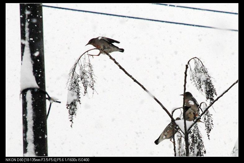 晚上回家时,天已经完全黑下来了,在路边我又看到了白天的那一幕:一群黑黑压压的小鸟,从一棵树飞到另一棵树,同样是叽叽喳喳的鸣叫,却听起来像哀嚎、像哭泣,撕裂着寂静的夜空,我恍然大悟:一定是这场大雪毁了它们的家,毁了它们以往的平静生活。害得它们饥寒交迫,无家可归,所以才这样漫无目的的到处飞、这样令人心碎地哀嚎。我仰头看着它们向远处飞去,再不忍心拍它们了,更为自己不能帮助它们而难过。这场大雪、这个寒冬,也许会夺去很多无助的小生命。