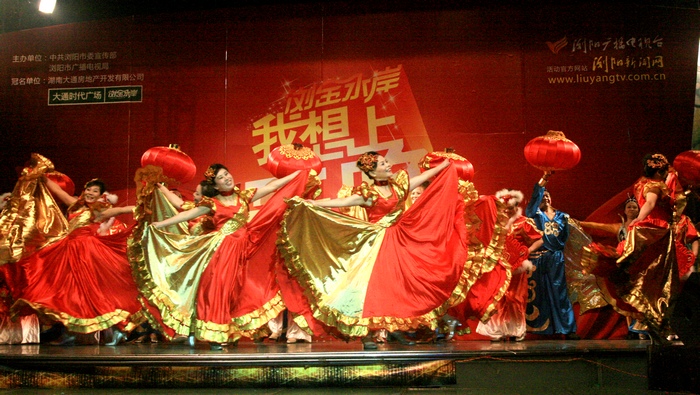 今晩在浏阳广电中心明珠才艺厅进行"我想上春晚"节目选拔半决赛,知青家园表演的大型舞蹈