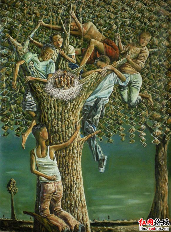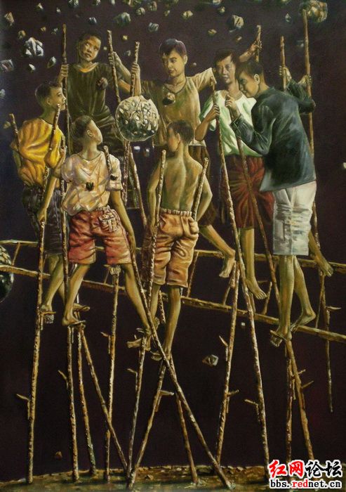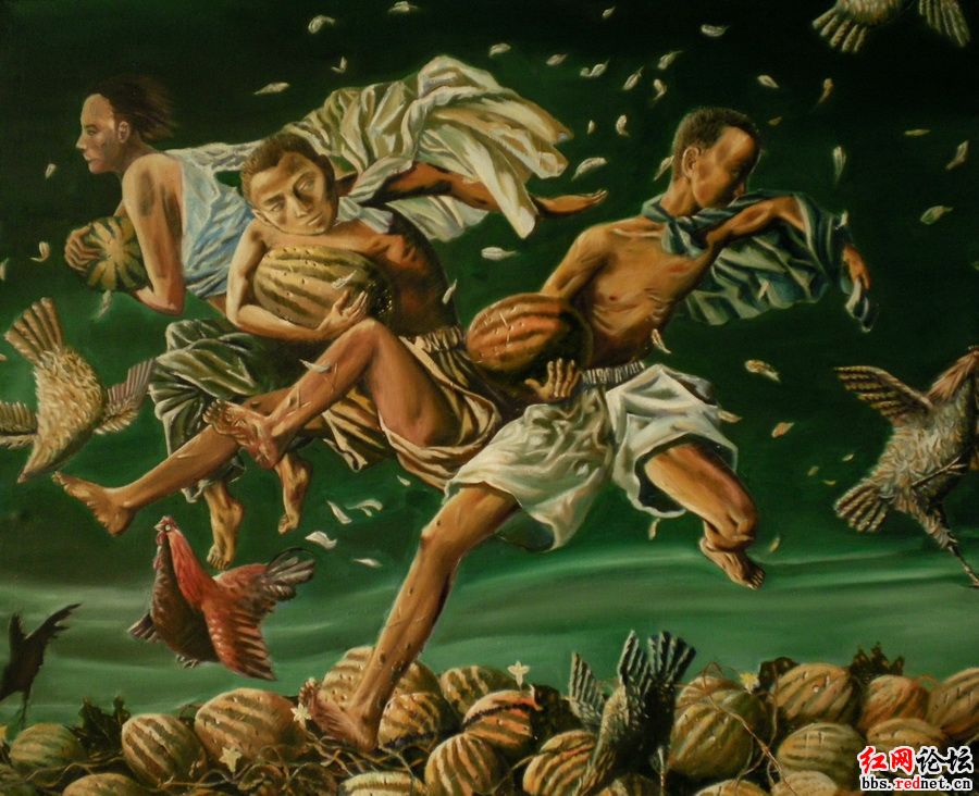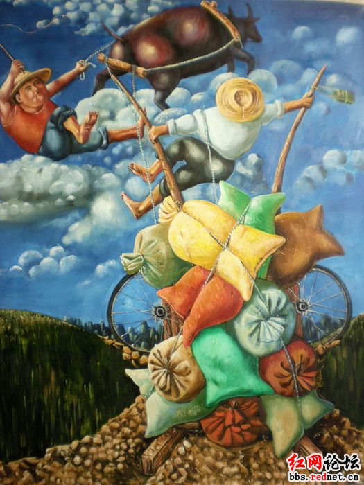 下学后他在家里种地、养鱼。很难想象一个农民能把绘画的热情保持近20年,并且没有减退的意思。用他自己的话说,就是对抽烟、喝酒、抹牌之类的完全没有兴趣,甚至反感,在农民中无疑是个异类。除了干农活就是画画!问他画了这么多年有没有跟什么人交流过?比如美院的老师之类的。他说没有,没有机会,并且他也不善于与人交流,他身边的人除了农民还是农民!他在读初中的时候自己订了《美术大观》,上课画,下课也画。现在订了很多杂志和画册,在家里反复的临摹和创作,近20年的作品堆起来比人还高!(无师自通?)