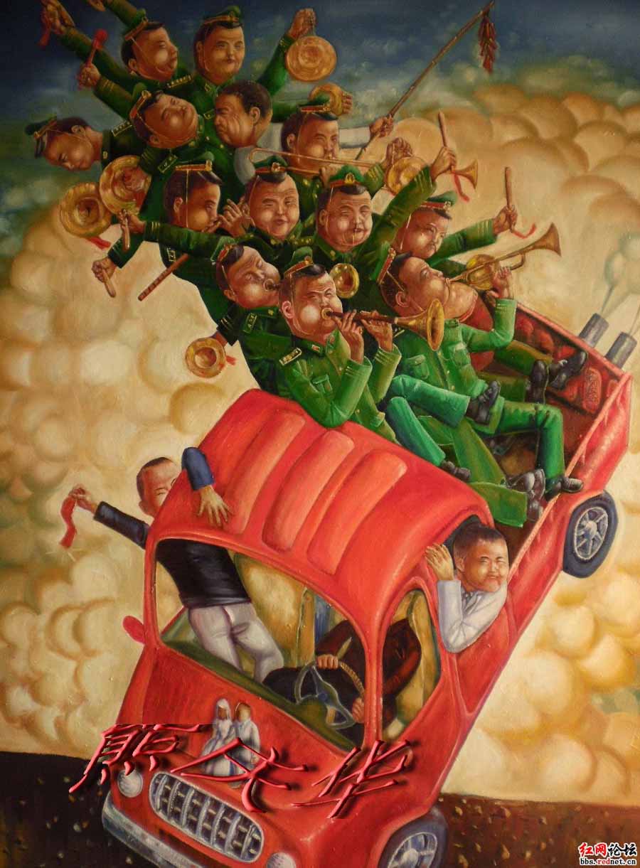 在熊庆华的眼中,仙桃农民所共有的“鬼”是什么样?显然不是“精明、奸诈”。从他的多幅超现实的人物画中,我们看到的人物都是一种统一的符号,他的《拉板车》、《拖拉机》、《玩龙灯》还有《迎亲》中的人物形象都是憨态可掬的胖子,一个个脸大头阔、肚肥腰圆,叼着烟,表情如一,全部一副怡然自得的样子。