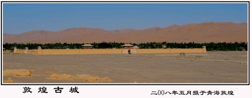敦煌,历经沧桑,几度盛褒,它走过了近五千年漫长曲折的里程。悠久历史孕育的敦煌灿烂的古代文化,使敦煌依然辉煌,那遍地的文物遗迹和典籍文献,精美的石窟艺术,和奇山异水,祁连山发源的党河,使这座石城戈壁绿洲越发郁郁葱葱,生机勃勃,就像一块青翠欲滴的翡翠镶嵌在金黄色的大漠上,更加美丽,更加辉煌。