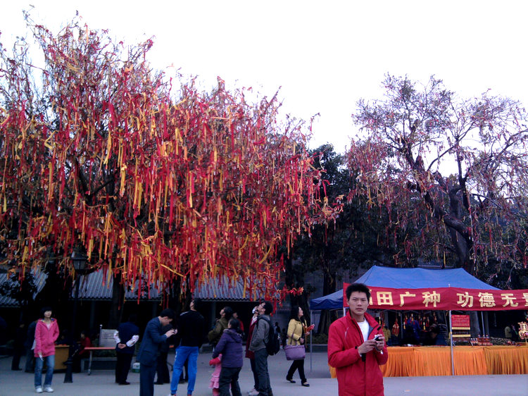 香炉台旁的大树上挂满了朝圣者的红绸带
