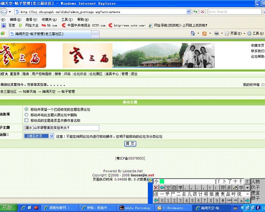 我试过把本栏一些帖子转别栏,打开“主题管理”,“复制主题”只能移去1楼主帖,2楼以下续、跟帖无法移去。而又试“移动主题”,则整个帖子移走了,本来不存。后点框内“保留转向”,帖子留下的其实是壳子,根巳在移去栏目了。如我昨在轶事移去旅游栏“失学农民画,未来大家?”……能否像老版一样,移后本栏保留原帖?