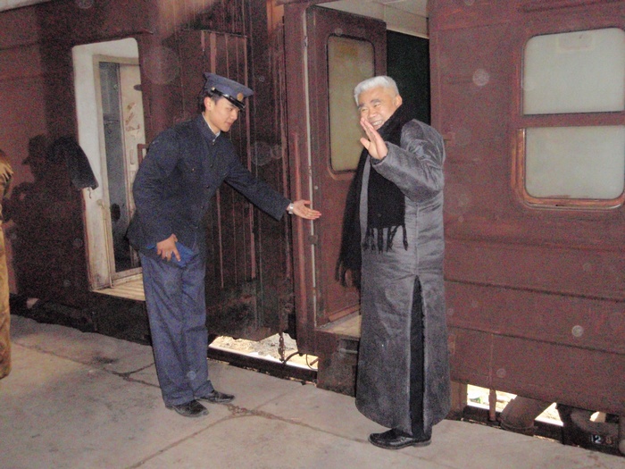 北站拍电影记 昨天,又是为拍电影《湘江北去》起了个早床;又是换上长袍马褂,不过是棉的;服装师可能记起了我,又往我头上扣一顶瓜皮帽,把我打扮成土地主;又是一上午我们群众演员没戏,但这回我们没有出长沙,就在老北站拍摄。我们这组来了八人,有两人没来,除达因女士、行者和我是上星期去靖港拍摄过外,另五位是上地团、渠江飞龙、曾老师和一对夫妇,他们都是初来的。 剧组将北站的一老货房布景成老北京站的站台,站台边停了五六节客车车厢,车厢被涂料刷成棕色,昨天在这里已拍完了青年毛泽东到了北京,今天还是利用这站台和车厢来拍毛泽东离开长沙,杨开慧来送他,我们群众演员就扮成旅客。 整个一上午就是他们两人的戏,毛泽东站在开动的火车车门口,杨开慧追赶着火车给毛送围巾,饰杨开慧的是《山楂树之恋》中的女主角周冬雨,是位纯青白净的小姑娘,相对来说,保剑峰饰毛泽东就成熟些。这个镜头拍了六七次才成功,每次杨开慧都得追着火车跑三四十米,也够累的。然后就拍毛泽东站在启动的火车上伸手想接围巾但又没能接到的镜头,站台上的摄影机也跟着火车同步的拍。过后,摄像机又移到火车上,导演也坐在火车里,从车上来拍杨开慧追火车的镜头,随后拍蔡和森,蔡畅、萧子升、向警予和杨开慧一道送毛的镜头,这里面有一个熟面孔,《天天向上》里的钱风饰萧子升。后来把我们所有的群众演员都叫到火车上,坐在靠站台的窗户位置上,从车下拍送别的镜头。就是这样导演从不同的角度反复来拍这个镜头。 昨天虽出了太阳,但气温仍低,站台上穿堂风大,尽管我们穿的是新做的棉长袍马褂,但还是感觉冷。站台上又没地方坐,站着也累,我们这几个人就坐到车厢里。看了车厢里的温度计,车厢里也只四度,但没风,到底暖和点,后来不少群众演员学我们样上车来避寒和休息。火车也听导演的指挥,一下开出站台,一下又倒回站台来,我们坐在车上随它来回奔波。另一组的一位老人说,“搞了半天才晓得拍电影都咯样做假的”,大家都笑了起来,不知他以前是真的不知道?还是说故意说的笑话。 火车拉车厢的镜头一直拍到中午一点多才结束,我们才去吃中饭,中饭还是盒饭,中饭后上车厢休息了一会儿。下午三时多才开拍群众演员上车的镜头,这时我们发现站在导演边上的一位气质高雅的中年妇女有些面熟,额头上有颗痣,这是奚美娟,在本片中她饰杨开慧的母亲,她真人比电视里得还漂亮些,导演对她格外亲切,左一口阿娟、右一口阿娟的。导演对这三个主要演员都特别客气,喊饰毛泽东的保剑峰叫保峰或保仔、唤周冬雨就冬雨、冬雨的,像母亲唤女儿似的,叫别的演员就只直呼他们所演的角色的名字。下午这个重头戏是杨开慧和她的母亲在站台上送毛泽东上火车,他们三人站在车门旁依依话别,我们就从他们的身边陆续上车。 开拍前只听见导演一人指挥的声音,“冬雨,往右移一点,多了,可以了”,“保峰不要说话了”,“阿娟,脸偏一点,好啦,开拍!”一声令下,我们群众演员就鱼贯的走向车厢的另一个门上车,我们只是作为他们三位主要演员的活动背景,摄影机拍的全是我们的背影,就这个镜头也反反复复拍了多遍,导演才满意。最后又叫些群众演员坐在车厢里,他们三人仍在车下话别,都是现场录音,我们都不能出声。等拍完这些,天完全黑了,才让我们卸妆收工,这也只让我们群众演员回家,他们还得继续拍下去,还在摄影场地吃晚饭,够辛苦的。 照片附后,因使用的是卡片机,在摄影棚内光线差,效果不好。
